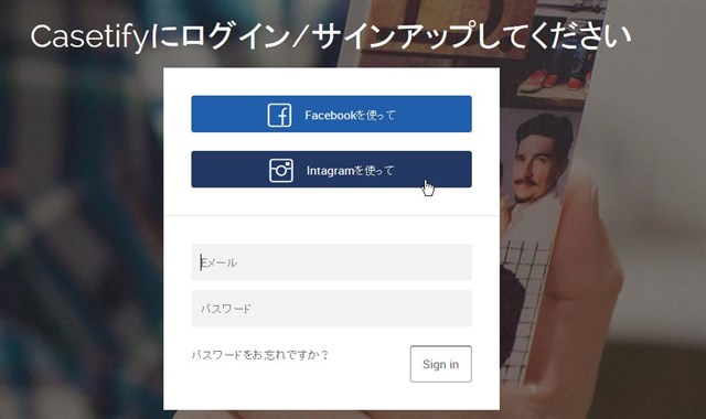 instagramアカウントかfacebookアカウント、もしくはCasetifyアカウントでログインする。